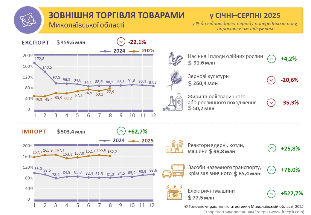 |  Інфографіка  «Зовнішня торгівля товарами Миколаївської області у січні–серпні 2025 року» |